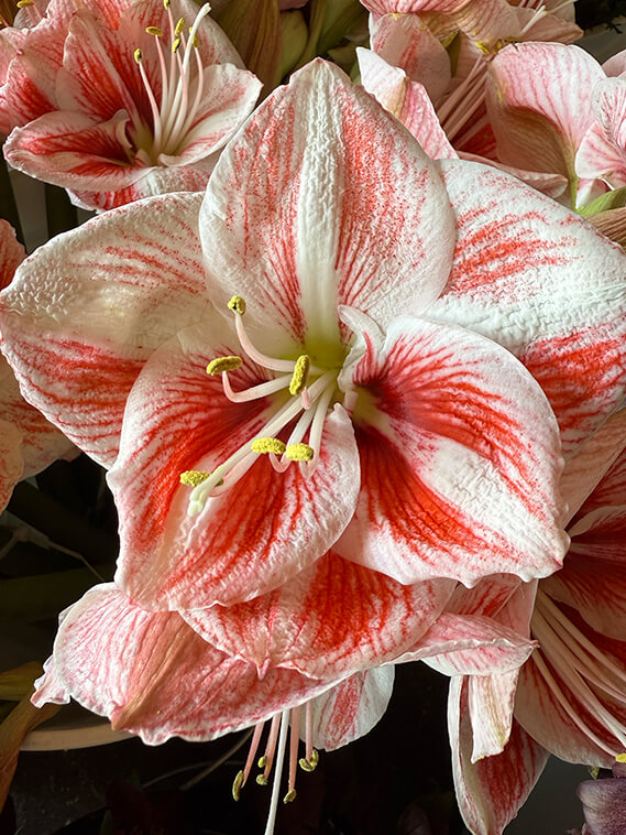 The red and white colors of the Candy Cane Amaryllis come from a "genetic blip" that causes parts of the bulb to have different colors, resulting in the distinct striped appearance perfect for the holidays.