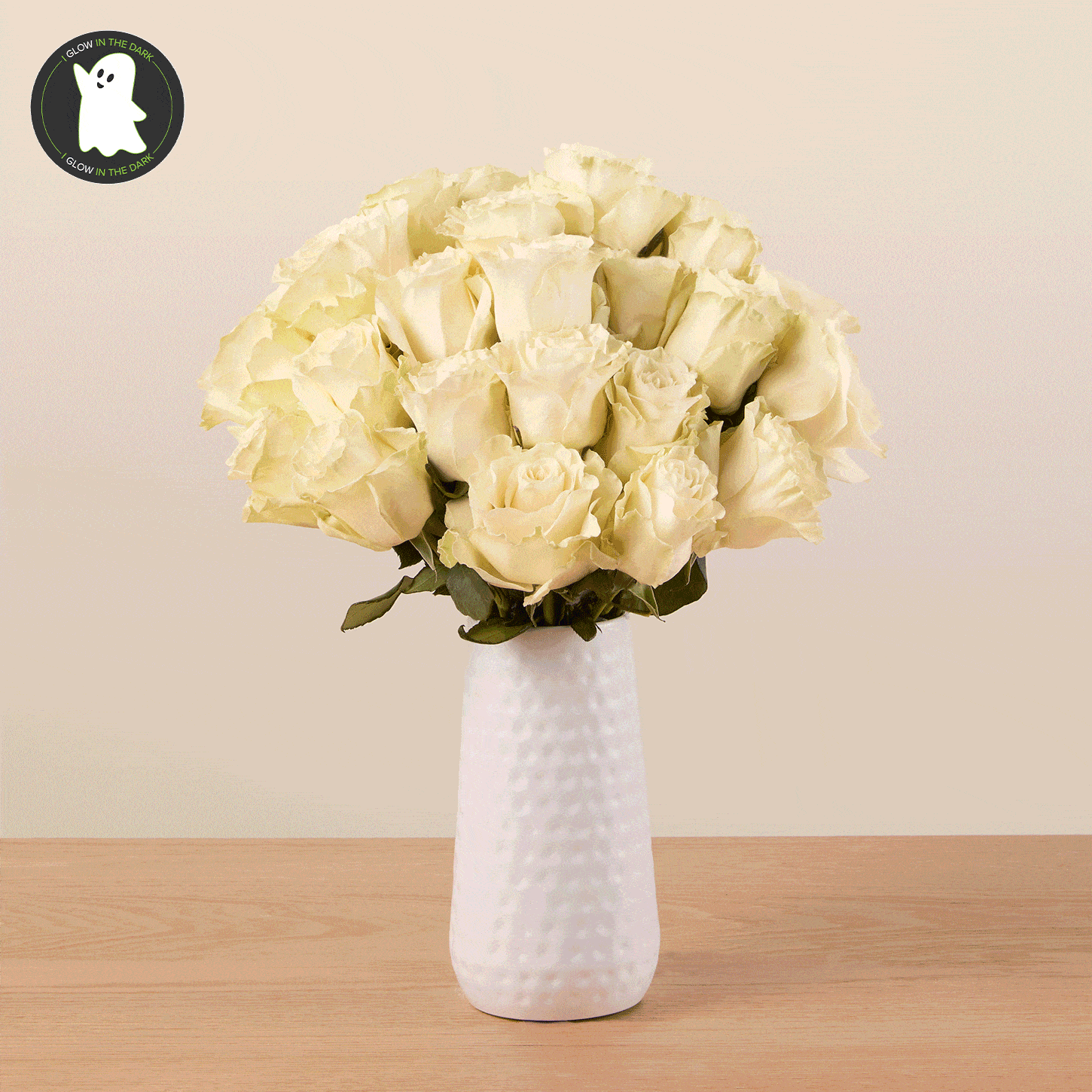 Turn off the lights to see the effect! For an extra-bright glow, try using a black light. Check out the sides of the roses when they’re glowing for a spooky surprise!